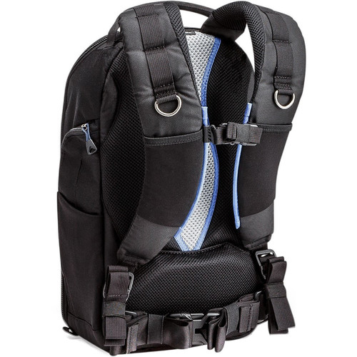 Comfort and weight distribution are prioritized through padded shoulder straps, a removable waist belt, chest connector, and a breathable air-mesh back panel with lumbar support and cooling air channels. Additional features include an ID card holder on top, stretch pockets on the shoulder straps with D-rings for front-mounted camera gear, and YKK zipper pulls that accept an optional padlock for security. This backpack weighs 4.59 pounds and is designed to serve photographers who require reliable, organized transport of professional camera equipment.
