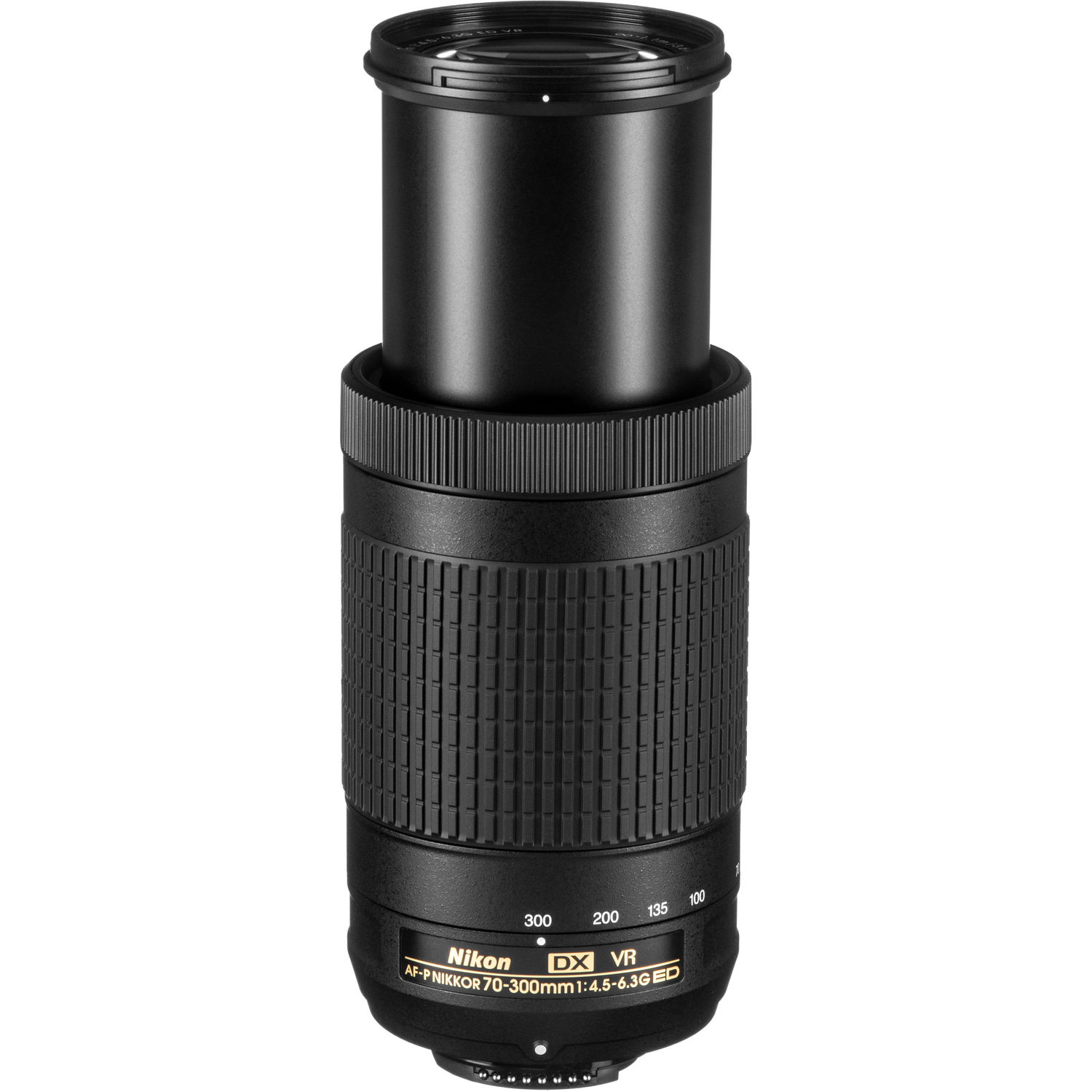 The Nikon AF-P DX NIKKOR 70-300mm f/4.5-6.3G ED VR is a telephoto zoom lens designed for DX-format Nikon F-mount cameras, delivering a 105-450mm equivalent focal length. The lens features an AF-P pulse stepping motor that provides quiet and precise autofocus suitable for both photography and video, along with Vibration Reduction image stabilization that compensates for up to four stops of camera shake for sharper handheld shooting. The optical design incorporates one extra-low dispersion element to reduce chromatic aberrations and a Super Integrated Coating to minimize reflections and flare, ensuring improved clarity and contrast across the zoom range.